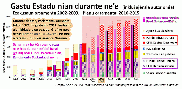 $320, inklui tokon $282 ba projeitu oleu pezadu. Iha loron 28 Janeiro, sira aprova ona OJE, maibe hasai transferensia husi Fundu Petroliferu iha tinan 2011 to'o bilaun $1,055, $321 liu Rendimentu Sustentavel Estimatiza. Bele hare mudansa iha grafiku tuir mai.