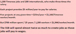 Is it worth it? If the $700 million the Government plans to “invest” on the Suai Supply Base project were handed out to 1,200 potential workers over 25 years, each person would receive $1,944 every month. We’re not suggesting that this be done, but only asking whether spending nearly twice as much to create a job as it will pay in salary makes sense.