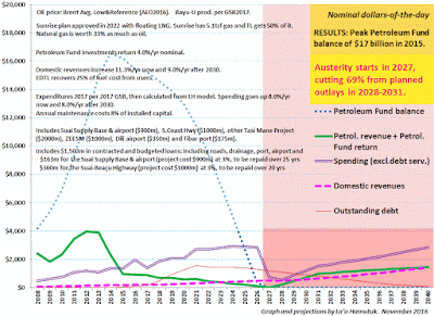Although the Ministry has done this for oil price and production assumptions, they have never made prudent estimates of investment return. Rather, Book 1 of this proposed budget explains that “The expected long-term nominal portfolio return remains unchanged from last year’s forecast of 5.7 percent nominal per annum.” However, Petroleum Fund returns were negative in 2015, 3.4% in 2014 and may be less than 5.7% by the end of 2016. In fact, since the Petroleum Fund was established, returns have exceeded 5.7% only once in the last 10 years (2013), so this can hardly be considered a “prudent” assumption.