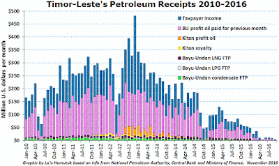 The proposed 2017 budget expects that Timor-Leste will receive only half as much money from Bayu-Undan during 2017-2021 as the proposed 2016 State Budget predicted just one year ago. The latest projections continue the trend of downgrading revenue projections every year since 2013, as shown in the graph at right. While the 2014 drop in global oil prices was significant, the reality is that the price of oil will soon be irrelevant – Timor-Leste’s producing reserves have already been almost entirely extracted. The ANPM recently authorized ConocoPhillips to drill three more production wells to suck up the last drops from Bayu-Undan; the cost of these wells will be deducted from Timor-Leste’s revenues, accelerating their decline.