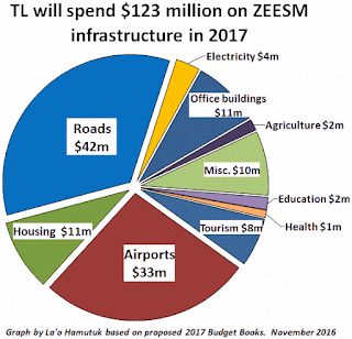The proposed budget will double the state subsidy for TimorGAP, from $6 million in 2016 to $11.9 million in 2017. In addition to promoting and managing the ill-advised Tasi Mane megaprojects, TimorGAP’s main activities seem to be propaganda to mislead people that there is a lot of undiscovered oil and gas in Timor-Leste, paying millions to Chinese companies for seismic exploration in unpromising waters, building petrol stations which compete with private companies that do not need state subsidies, serving on joint committees with Australia about managing the stalled Sunrise project, starting short-lived joint ventures (such as Gap-MHS) to transfer part of the operational costs of Kitan from the nation’s petroleum revenues to their own treasury, and dreaming of trips to Cuba for speculative oil exploration.Although their report to Parliament does not include a balance sheet, TimorGAP’s 2015 Annual Report shows that the state-owned company ended that year with $1.2 million in the bank. The $12 million they are asking you for now is twice as much as the office of the President of the Republic has asked for, or more than 2/3 of Parliament’s entire proposed 2017 budget. Is it worth it?