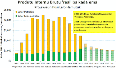 Governu nia komunikadu imprensa sita Panorama Orsamentál husi Orsamentu Estadu Livru 1 katak “setór la’ós-petrolíferu reprezenta 39% husi produtu Internu Brutu [PIB] reál Timor-Leste nian no katak PIB la’ós-petrolíferu sa’e ba 5,9%”. Maske ida ne’e teknikamente loos, maibé subar pontu xave rua: