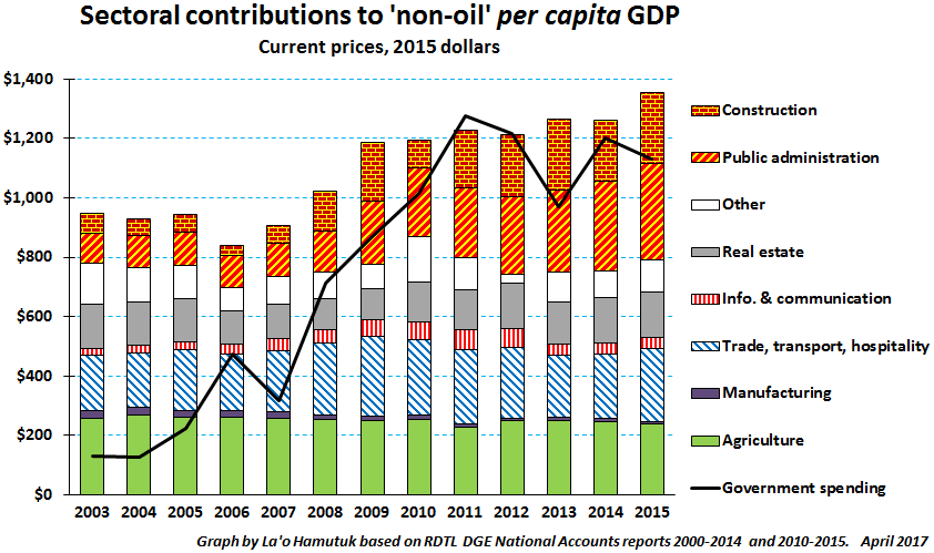 If Timor-Leste can develop a strong, diverse economic base, this austerity will not be necessary. Unfortunately, the so-called ‘non-oil economy’ is still not strong enough to sustain the country.About half of the ‘non-oil’ economy is fueled by state spending of oil money, as exemplified by construction and public administration. After adjusting for population growth and inflation, the productive sectors of agriculture and manufacturing have shrunk during the fifteen years since independence.