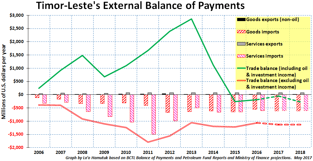 Another way to look at Timor-Leste’s economy is to examine the money flowing in and out of the country. We import more than $500 million worth of goods each year, and about the same amount of services. Non-oil goods exports, almost all coffee, are around $20 million. As the red line in the graph shows, our non-oil trade deficit is about a billion dollars each year, and hasn’t changed much since 2013. The green line shows the balance after oil revenues and returns from investing the Petroleum Fund are added in. This first fell below zero two years ago, and will converge with the red line as the Petroleum Fund is depleted. Although the deficit may decline after Timor-Leste has no more money to pay for imports, the effects on people will be disastrous if local production has not significantly improved.