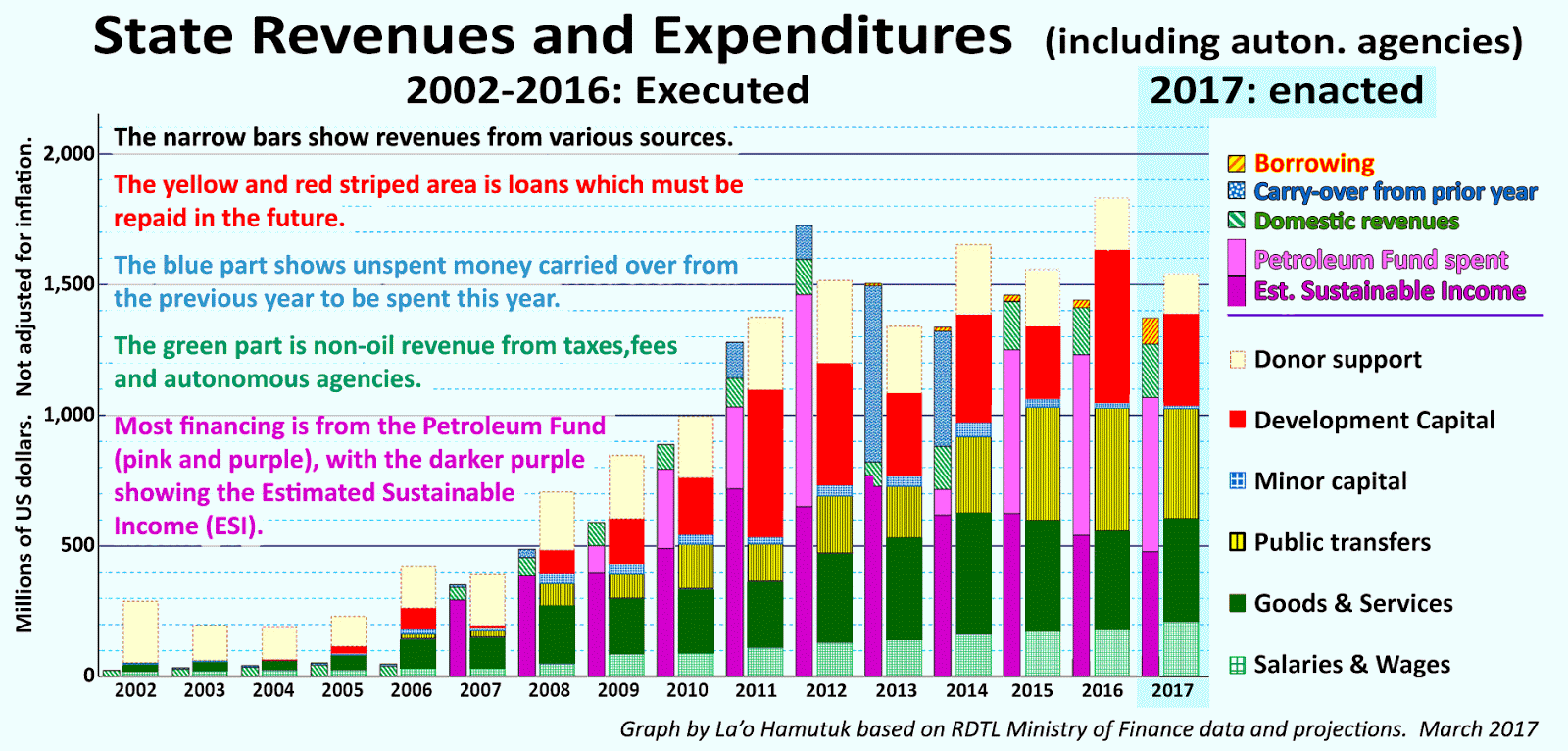 Although oil companies have explored Timor-Leste for oil and gas for more than a century, large-scale extraction activities began in the Timor Sea in the late 1990s. Since then, Timor-Leste’s government has received about US $21 billion in oil revenues from Elang-Kakatua, Kitan and Bayu-Undan – and only about $0.4 billion more remains.Timor-Leste has wisely invested most of its oil income in its Petroleum Fund, whose investments have earned more than $3.8 billion. Timor-Leste’s government has spent nearly $9 billion of the money from oil and investments, and about $16 billion remains in the Fund, whose balance peaked about two years ago and has begun to decline. Between 2002 and 2016, oil money paid for 83% of all government spending. The Ministry of Finance expects the Petroleum Fund to finance 75% of state activities during the next five years, although oil and gas income in 2016 was only one-eighth of its 2012 peak.