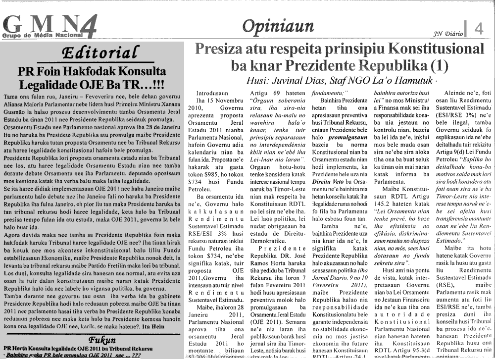 Husi: Juvinal Dias, Staf NGO La’o Hamutuk. Publika ona iha Timor Post no Diario Nasional, 11 Fevereiru 2011