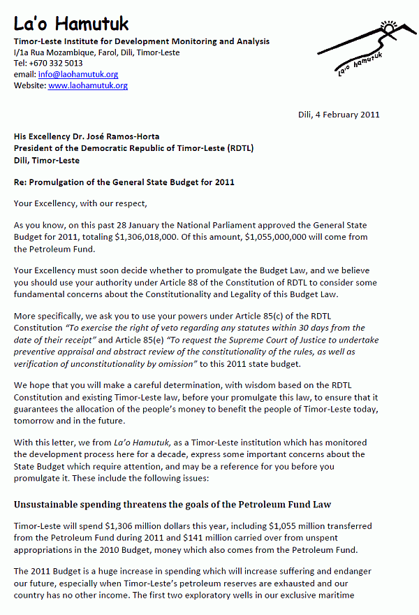 Last Friday, La'o Hamutuk wrote a letter to President Jose Ramos-Horta (Tetum original) urging him not to promulgate the $1.3 billion 2011 State Budget that Parliament passed at the end of January.