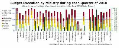 Grafika hatudu wainhira kada orgaun gasta nia osan durante 2010, nudar persentajen ida husi sira nia total dotasaun orsamental. Kada barra reprezenta total montante ne'ebe gasta durante tinan ida; karik sira gasta ona alokasaun tomak, hatudu iha grafiku ne'e bele to 100%. Barra mutin iha okos liu hatudu gastus durante trimestre primeiru (Janeiru too Marsu), barra ho kor kinur ne'e indika gastus durante fulan tolu oin mai, no kor laranja salpikadu (titik-titik) indika gastus durante trimestre terseiru. Tamba osan barak mak gasta iha fin do ano, ami fahe trimestre ikus nian ba metade: parte ho linhas diagonal ne'e indika gastus ne'ebe hahu husi 1 Outubru to 12 Novembru, no ho kor mean los ne'e indika gastus hahu 13 Novembru to fin do ano 2010. Linha matak iha barra liman los hatudu (skala liman los nian husi 1-12 hatudu gasta lalais husi orgaun depois 12 Novembru to fin do ano kompara ho gastus iha ne'ebe sira halo iha 2010 molok 12 Novembru.
