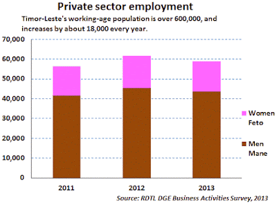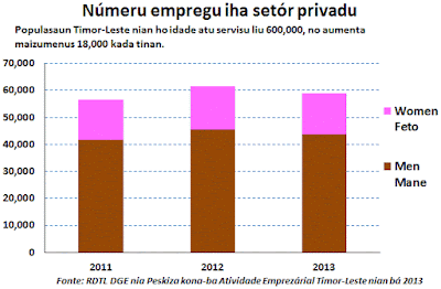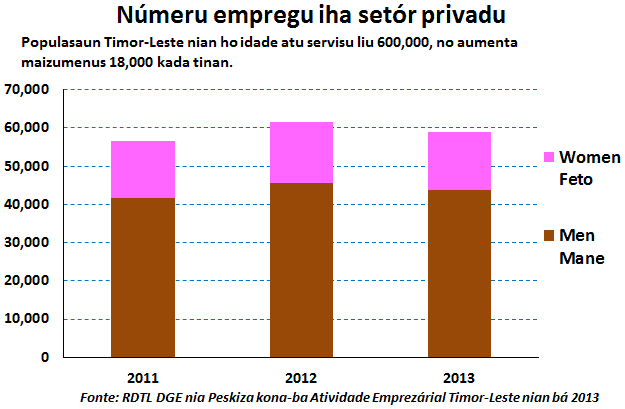 Foin lalais, ami haree estatístika sira kona-ba empregu ne’ebé halo ami sente urjénsia boot liu. Tuir Peskiza kona ba Atividade Negósiu iha Timor-Leste 2013, empregu iha setór privadu tun tiha durante 2012-2013, no iha tempu hanesan povu Timor-Leste ne’ebé tama ba kampu servisu na’in tinan-tinan hamutuk ema na’in 18,000. Bainhira Governu implementa sira nia promete sira atu hadi’a sira nia servisu funsionáriu públiku sira, nune’e funsionáriu iha setór públiku bele tun. Povu sira, parseiru dezenvolvimentu sira no Governu mós tenke servisu hamutuk hodi kria empreza sira ne’ebé mak bele suporta ita nia família, ekonomia no estadu. Ida ne’e difisil liu duke fahe kontratu estadu nian ba kompañia privadu lokál sira.