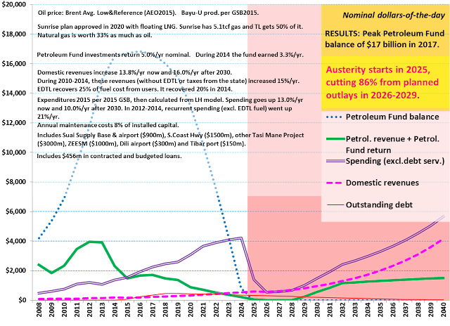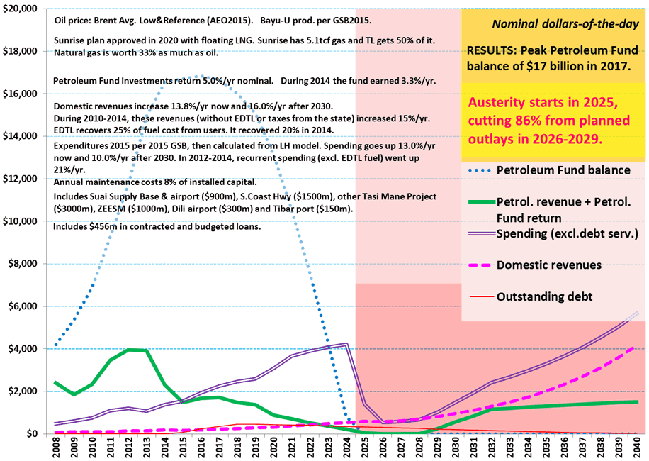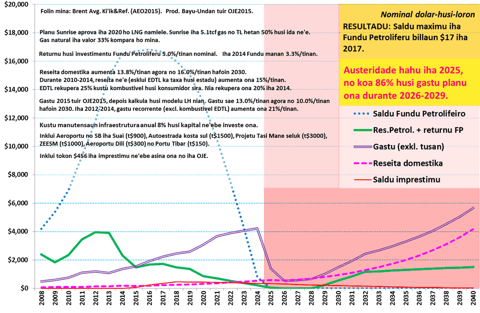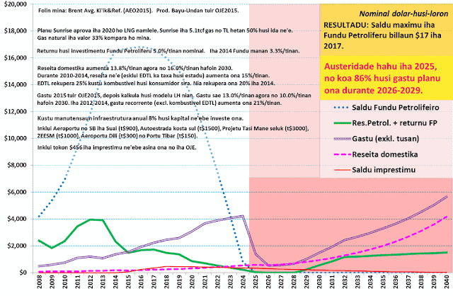 Karik gastu estadu ida ne’e nafatin la’o tuir lala’ok orsamentál nian ohin loron, Fundu Petrolíferu sei automatikamente tun maka’as iha 2017, maski ita bele hetan kresimentu double digit ba rendimentu doméstiku anuál nian, no Fundu ne’e sei hotu duni lalais tinan lima hafoin produsaun hosi Bayu-Undan remata iha 2020.