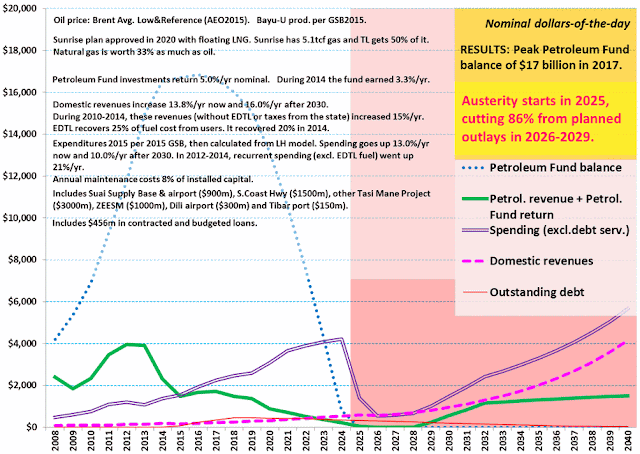 The numbers underlying the preceding graphs are at left -- click on the table to make them readable. Figures are in millions of U.S. dollars-of-the-day, not adjusted for inflation. Petroleum income after 2028 and ESI after 2020 include the Greater Sunrise field (gray).