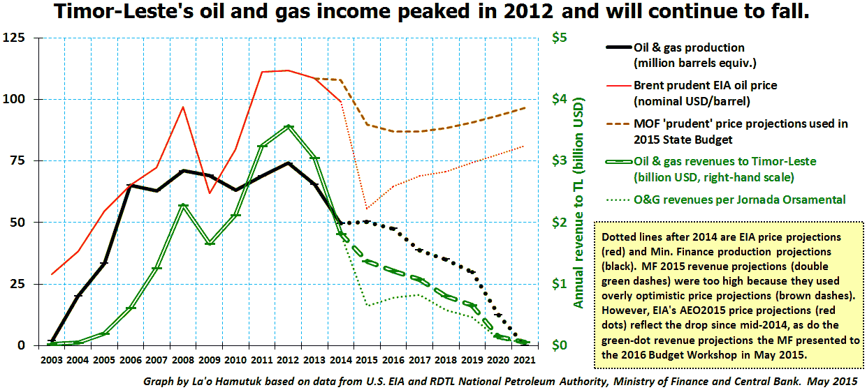 After we published our April article, the U.S. Energy Information Administration (EIA) released its Annual Energy Outlook 2015, with updated projections for oil prices through 2040. Timor-Leste’s Ministry of Finance used these projections to revise its expectations of Timor-Leste’s oil and gas revenues, which were shared on page 28 of its presentation at the Jornada Orçamental budget workshop on 14 May 2015. The graph at right is revised from La’o Hamutuk’s April paper, showing the Ministry’s new revenue estimates and the green dotted line at lower right.