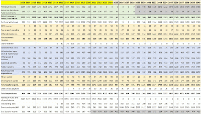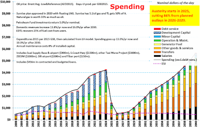 The scenario also makes the overly optimistic assumption that non-oil (domestic) revenues will increase 16% every year from 2030 on, which is probably unachievable even with radical reprioritization of the economy and tax laws, especially after the severe cutbacks required when the Petroleum Fund runs out. However, this factor does not significantly affect how long the Petroleum Fund will last.