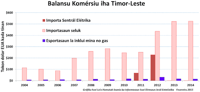 Timor-Leste’s balance of trade shows that in 2014 we spent $526 million on imported goods, while our income from non-oil exports came to only $14 million, of which 95% was from coffee. This unsustainable $511 million trade deficit was about the same as 2013.