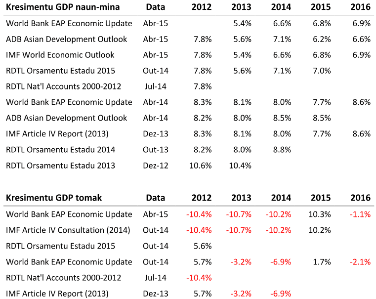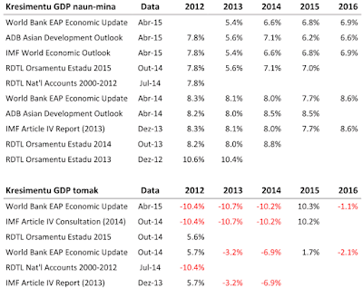 Ami hare katak Parseiru Dezenvolvimentu sira nia relatóriu sira, inklui Governu nian, rekoñese duni katak Timor-Leste nia setór ekonomia naun petróleu stagnadu. Maski GDP la’ós meius ne’ebé di’ak atu sukat dezenvolvimentu ekonómika (tanba meius ne’e sukat osan de’it, la sukat povu, liu liu povu kiak ne’ebé barak), maibé ami la iha dadus seluk. Iha 2012, ita nia GDP naun petróleu iha billaun $1,246 ka 22% hosi total GDP Timor-Leste nian. Maski nune’e, metade hosi númeru GDP naun petróleu ne’e mai hosi despeza estadu (osan mina-rai) ba konstrusaun no administrasaun públiku nian. Bainhira kresimentu iha despeza estadu nian neineik, kresimentu GDP naun petróleu nian mós neineik; GDP total tun tanba rendimentu petróleu mós tun. Tabela iha liman los hatudu karak Governu no Instituisaun Finansial Internasionál sira nia figura ba GDP naun petróleu no GDP total nia kresimentu ne’ebé tun tanba realidade tuir duni projeksaun no estimatizasaun nian.