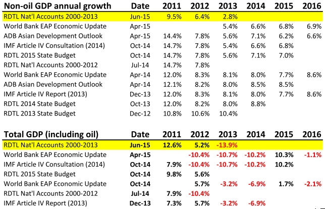 Update: At the Development Partners Meeting on 6 June, Timor-Leste's Directorate-General for Statistics released its report on National Accounts 2000-2013. The new information, which we added to the above table as yellow lines, shows a sharper decline in non-oil GDP growth rates than discussed above, including more accurate calculations for 2011 and 2012. After adjusting for population, the non-oil economy didn't grow at all during 2013.