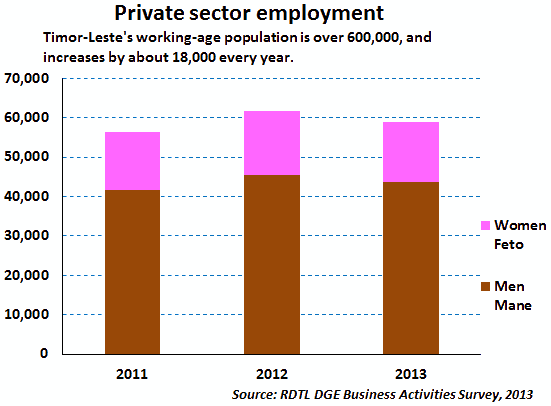 Recently available employment statistics heighten our sense of urgency.  According to the 2013 Business Activities Survey, the number of private sector jobs declined between 2012 and 2013 – while Timor-Leste’s working-age population goes up by about 18,000 every year. As the Government implements promises to make the civil service more efficient, public sector employment may also drop. The people, private sector, development partners and government should work together to create livelihoods which can sustain our families, our economy and our state. This will require more than simply allocating public contracts to local businesses.