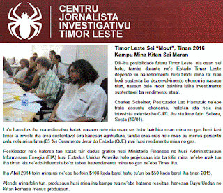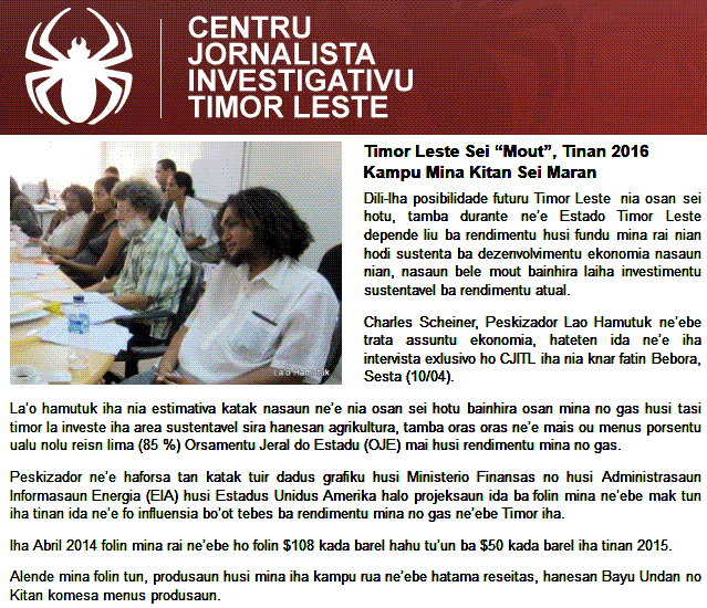 On 13 April, CJITL published an article titled Timor-Leste Will ‘Sink’ in 2016 when Kitan Oil Field will be empty (Timor Leste Sei ‘Mout’, Tinan 2016 Kampu Mina Kitan Sei Maran). The article was based on an interview with La’o Hamutuk researcher Charles Scheiner, who said that, “there is a possibility that Timor-Leste’s money will run out in the future, because the State depends mainly on oil revenues to sustain the country’s economy. The country might sink because there hasn’t been enough investment to develop sustainable sources of revenue”.  On 17 April, La’o Hamutuk published Timor-Leste’s Oil and Gas are Going Fast.