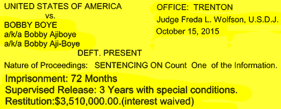 On 15 October, U.S. Federal Judge Freda Wolfson sentenced Boye to six years in prison, followed by three years of supervised release. He will begin his prison time on 30 November, probably at the Fort Dix Federal Correctional Institution in New Jersey, a former U.S Army base. The court also ordered Boye to pay $3.51 million in restitution to the U.S. Treasury, to be distributed to Timor-Leste's attorney Pierre-Richard Prosper of the Arent Fox law firm. The payment is due immediately, although a schedule may be worked out. The Court generously did not require Boye to pay interest (which could be a million dollars or more) and ignored La'o Hamutuk's explanation that Boye's crimes could cost Timor-Leste $176 million.