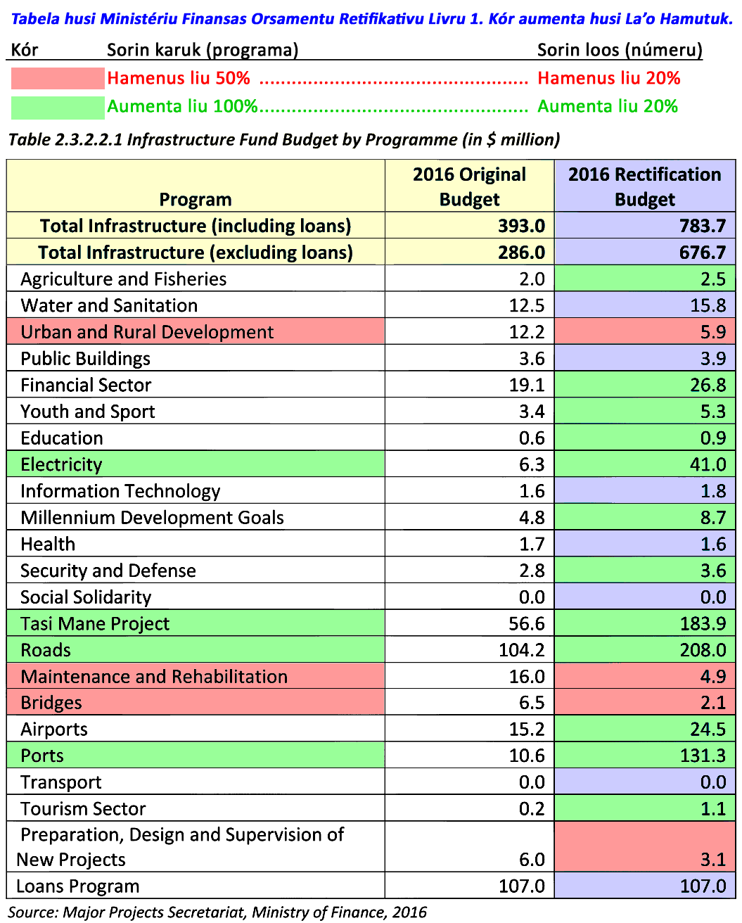Atu finansia projetu infrastrutura boot sira balu, Governu Timor-Leste propoin atu gasta tokon $391 tan iha tinan ida ne’e atu aumenta ba biliaun $1.562 ne’ebé aloka ona iha Orsamentu orijinál 2016. Orsamentu biliaun $1.953 ida ne’e sei sai orsamentu ida ne’ebé boot liu durante istória Timor-Leste. La’o Hamutuk preokupa teb-tebes katak proposta revizaun ida ne’e sei halo hotu Timor-Leste nia riku-soin limitadu ne’e, ne’ebé tuir mai sei hatún sustentabilidade Fundu Petrolíferu nian liu hosi soe tan osan povu nian iha projetu sira ne’ebé nia benefísiu la klaru.