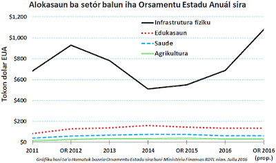 Maske alokasaun orsamentu ba infrastrutura fíziku kontinua sa’e, maibé investimentu iha rekursu umanu, servisu báziku no ekonomia naun petrolíferu nafatin la adekuadu, no despeza ba asisténsia saúde, edukasaun no agrikultura tun durante tinan rua ikus ne’e. Revizaun orsamentál ida ne’e tuir mai sei aumenta despeza ba mega-projetu infrastrutura fíziku duvida sira. Gráfiku tuir mai hatudu hela oinsá infrastrutura fíziku sei hetan osan barak liu tan duke setór sira.